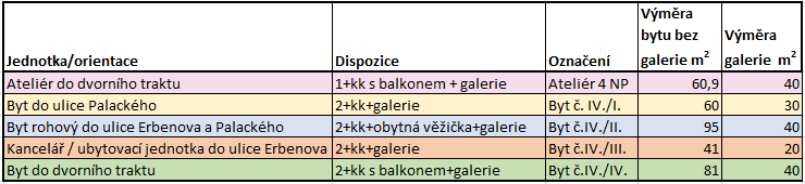 V půdní vestavbě vznikly vzdušné bytové jednotky nevšedního charakteru. Prostor dává možnost pro kreativní bydlení. Každý byt má galerii, která dává možnost vzniku prostor jak pro práci, tak pro kreativní chvilky. Interiér je okořeněný stropními trámy, kovovým zábradlím na galeriích, koupelny v dekoru mramoru, šatnami, kuchyněni v retro stylu, čímž provazuje jak "staré" prvky tak moderní bydlení.